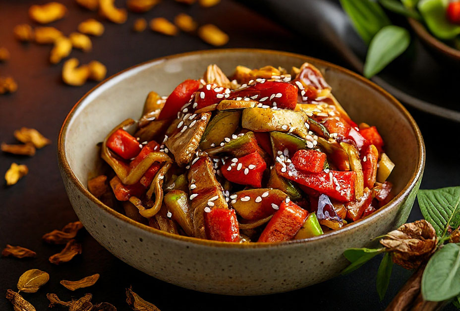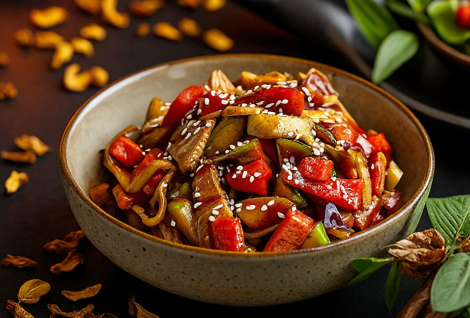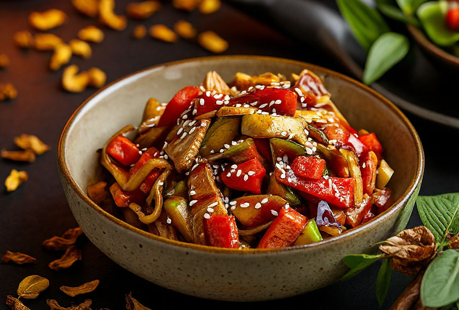 Курица, овощи, соус унаги, кунжут, соевый соус, кунжутное масло