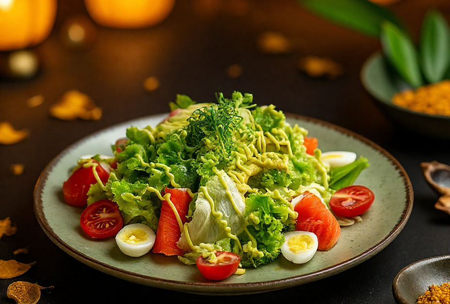 Микс-салат, яйца перепелиные, помидоры черри, авокадо, творожный сыр, лосось, медово-горчичный соус, соус авокадо, соус бальзамик