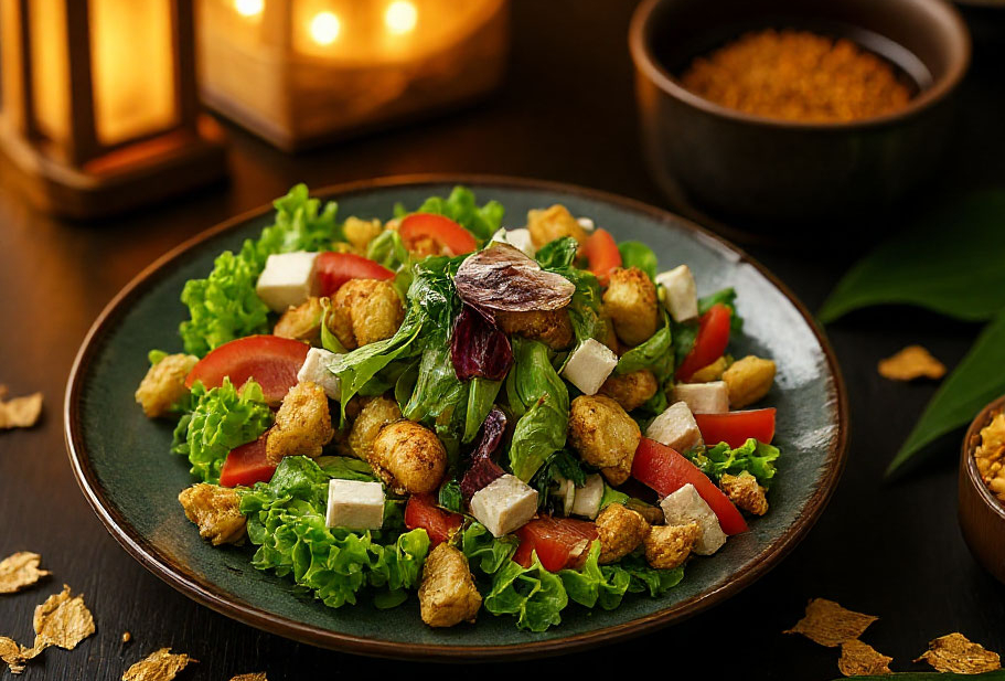 Баклажаны, микс-салат, помидоры, сыр фетакса, кунжутное масло, сладкий чили, специи