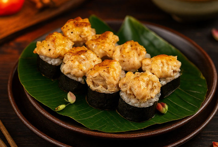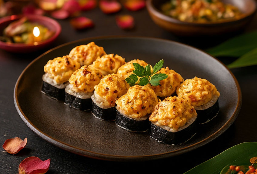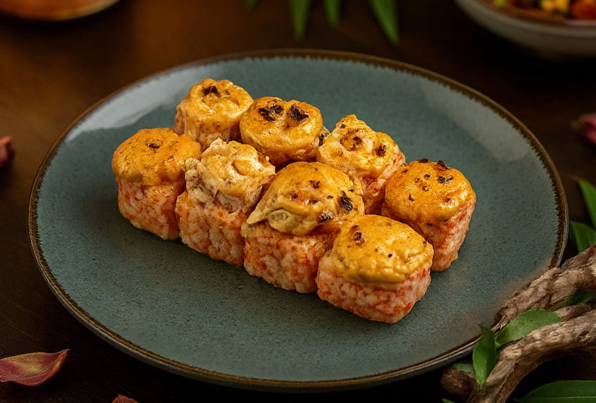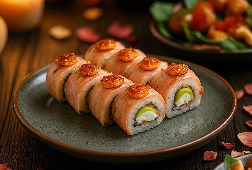 Томаго блин, сыр хохланд, сыр Филадельфия, лосось, огурец, бекон, соус Спайси